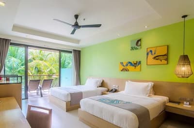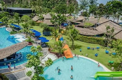 Que vous passiez vos vacances à deux ou en famille, il y a forcément une chambre pour vous à l’Holiday Inn Resort Krabi Ao Nang Beach ! L’hôtel a même construit une aile dédié à chaque catégorie de vacanciers. En revanche, à l’extérieur, vous faites parties communes ! L’immense piscine qui longe tout le complexe est un véritable paradis pour les enfants. Ils s’amusent comme des fous grâce aux quatre toboggans aquatiques et à plusieurs fontaines à eau. Juste à côté se trouve une aire de jeux pour les petits. Quant aux ados, ils se retrouvent dans la Teen Zone. Vous pourrez profiter de l’ambiance depuis votre transat qui borde le bassin, ou un peu plus isolé dans le vaste jardin paysager. Pour vous désaltérer, vous avez l’embarras du choix ! Prenez un verre directement dans la piscine les fesses dans l’eau au Lagoon Bar. Bénéficiez de l’Happy Hour entre 17h00 et 20h00 au Wave Bar en face du lobby. Et contemplez le coucher de soleil depuis la terrasse de l’Island Bar dans le jardin. Pour mettre une claque à votre stress, rendez-vous au Tea Tree Spa. Entouré d’un décor végétal, vous rendez les armes entre les mains des thérapeutes. Sachez enfin que l’hôtel n’a pas les pieds dans la mer mais il suffit de franchir la route pour y mettre les vôtres !