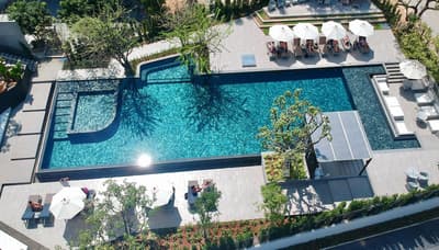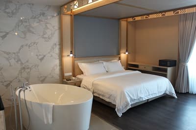 The Pavilions Anana Krabi est le rêve de toute une vie. Et c’est réussi ! La biographie du propriétaire, Wolfgang Grimm, est digne d’un bouquin, mais son souhait le plus cher était de réussir à combiner l’hôtellerie et l’écologie. C’est ainsi qu’est né l’Anana Ecological Resort, qui rentre dans le giron de The Pavilions Hotels & Resorts en avril 2021. Situé face à la falaise d’Ao Nang, l’architecture du bâtiment principal ne fait pas spécialement rêver, en revanche, vous changez d’avis une fois dedans. Dès la réception, vous contemplez la nature qui entoure l’hôtel grâce à de grandes baies vitrées. Les élégantes bibliothèques illuminées incrustés dans les murs renferment de magnifiques terrariums. A l’extérieur, la piscine à débordement de 25 mètres vous tend les bras ! Le bassin, construit en pierre volcanique, contient quatre espaces : une pataugeoire, un jacuzzi, un espace pour nager et un salon aménagé au même niveau que l’eau. Sans doute le meilleur spot de l’hôtel pour boire un cocktail ! Direction ensuite l’Asana Spa by the Pavilions pour profiter de votre massage de bienvenue. La déco manque un peu de chaleur mais vous disposez de 210 m² pour vous ressourcer le corps et l’esprit. Vous ne pourrez pas rejoindre la plage à pied depuis l’hôtel (à moins d’avoir vraiment envie de marcher !) mais on vous y emmène gratuitement en 10 minutes à bord d’un tuk tuk. L’endroit est magnifique : la plage, laissée à l’état naturel, est bordée de mangrove et de palmiers. Installé sur votre transat en bambou, pas de panique : vous avez accès au wifi !