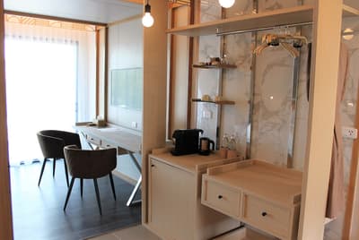 Ce petit nid douillet, offre confort et intimité dans son ensemble calme et serein. De sa terrasse ou son balcon complètement aménagé, elle profite d’une vue apaisante sur la végétation luxuriante du complexe. Elle dispose d’une baignoire à hydromassage en chambre, idéale pour se relaxer et profiter du calme. Salle de bain chic.