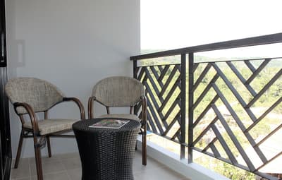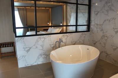 Cette suite bien-être est confortable et agréable. De son balcon complètement aménagé, elle profite d’une vue apaisante sur la végétation luxuriante du complexe. Elle dispose d’une baignoire à hydromassage en chambre, idéale pour se relaxer et profiter du calme. Salle de bain chic.