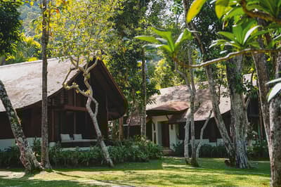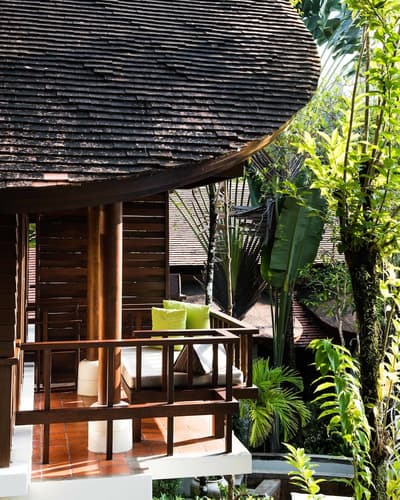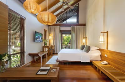 Située à l’étage, elle est idéale pour les couples et baigne dans une atmosphère légère et sereine. Elle profite d’une vue merveilleuse sur la verdure luxuriante et sur le complexe. Son intérieur dispose d’un canapé-lit installé tout près de la fenêtre vitrée. Salle de bain semi-ouverte avec une baignoire en pierre et une douche à effet de pluie.