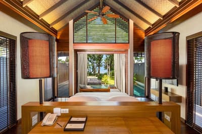Le top ! Cette belle suite en bord de mer du style d’un petit bungalow offre une merveilleuse vue sur le rivage. Elle procure intimité et calme, en plus d’être spacieuse et confortable. Sa terrasse est aménagée de fauteuils et d’une petite table à manger. Elle dispose d’un vrai salon meublé d’un canapé et d’un petit bureau. Salle de bain semi-ouverte avec baignoire et douche à effet de pluie.