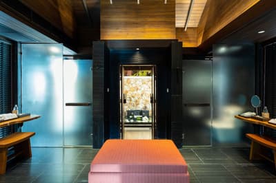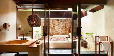Installée à l’étage, elle profite du grand air et d’une vue merveilleuse sur la piscine du complexe. Elle dispose d’un balcon aménagé d’un lit de repos, idéal pour apprécier le beau temps. Son intérieur est meublé d’un petit bureau et d’un très grand lit. Salle de bain semi-ouverte avec une baignoire en pierre et une douche à effet de pluie.