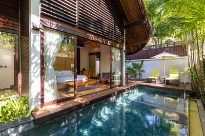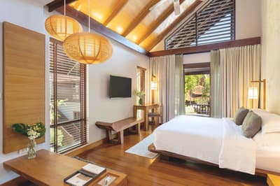 Dans le style dans petit bungalow en bord de plage, elle offre une atmosphère sereine et calme avec une merveilleuse vue mer. Entourée par le jardin tropical luxuriant, elle est idéale pour se relaxer et apprécier le climat doux de la Thaïlande. Sa terrasse dispose de beaux fauteuils. Salle de bain semi-ouverte avec une baignoire en pierre et une douche à effet de pluie.