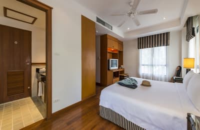 La chambre est décorée dans des couleurs vives avec des œuvres d'art violettes royales thaïlandaises et un mobilier moderne. La salle de bain est lumineuse et bien équipée avec une baignoire, le tout dans une atmosphère cosy et relaxante !
