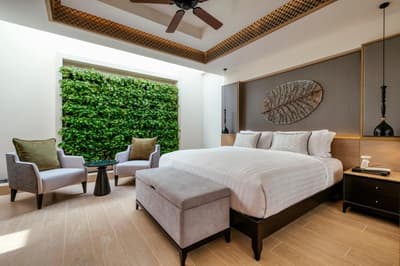 L’ensemble bénéficie d’une décoration moderne et raffinée et comprend des lits king et jumeaux, un beau parquet ciré, des éléments de décoration asiatique et les couleurs sont sobres et neutres. La cuisine est entièrement équipée et le pavillon de la salle à manger en verre est entièrement climatisé. Le tout dans une ambiance sereine !