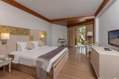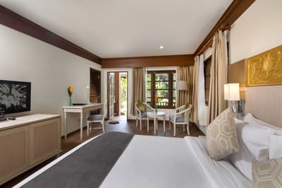 Cette chambre Deluxe bénéficie de vues exceptionnelles sur la piscine et le jardin et dispose d’une terrasse avec table et chaises d’où vous pourrez prendre vos repas tout en contemplant la vue magnifique.