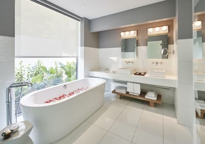 La décoration est élégante et cosy avec un lit king, paré de draps en coton égyptien et du mobilier aux couleurs tropicales. Elle est dotée également d’un bel espace de vie avec salle à manger intérieure et la salle de bains comprend une baignoire autoportante avec double vasque. Le tout dans une atmosphère relaxante et tropicale !