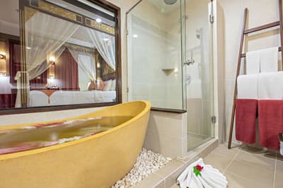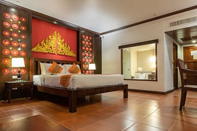 L’ensemble est dans un style de décoration thaïlandaise avec des meubles en bois de teck sculptés à la main et la chambre est dotée d’un grand lit à baldaquin. La salle de bains comporte une douche à effet pluie et une superbe baignoire, le tout dans une ambiance zen et exotique !