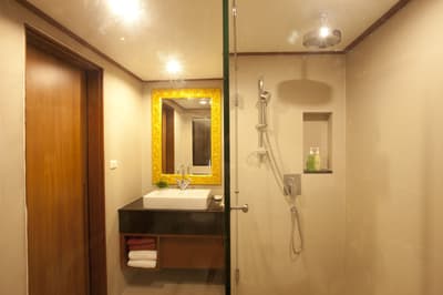 L’ensemble est dans un style de décoration thaïlandaise avec des meubles en bois de teck sculptés à la main et la chambre est dotée d’un grand lit. La salle de bains comporte une douche à effet pluie, le tout dans une ambiance zen et exotique !