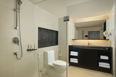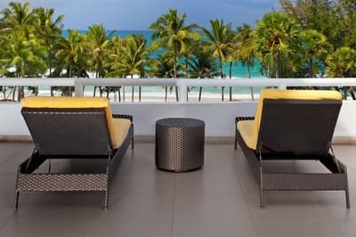 Très spacieuse, la suite junior est encore plus agréable et confortable. De son balcon aménagé de longues chaises, elle profite d’une vue merveilleuse sur l’océan et sur les cocotiers. Elle est idéale pour les couples et baigne dans une atmosphère romantique et reposante. Petit coin salon en chambre avec une banquette et elle peut accommoder un lit King ou 2 lits doubles. Salle de bain chic avec baignoire.