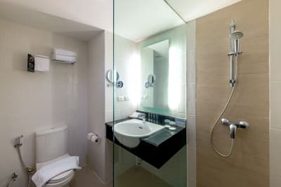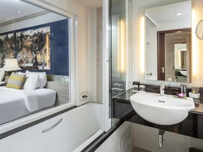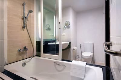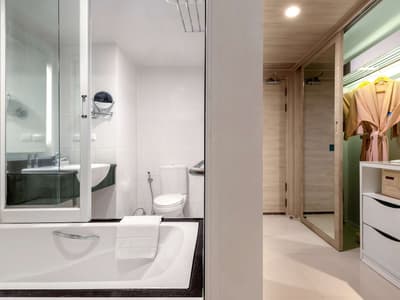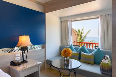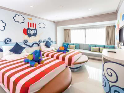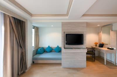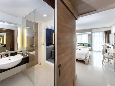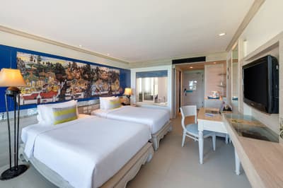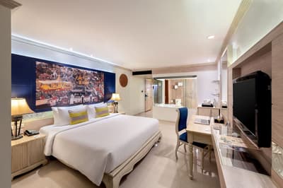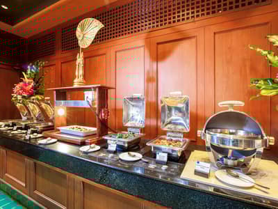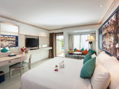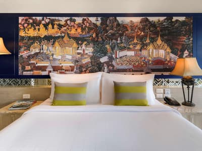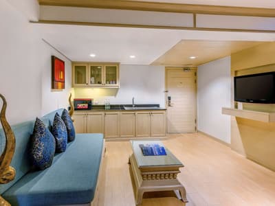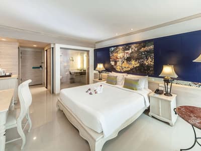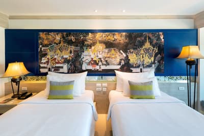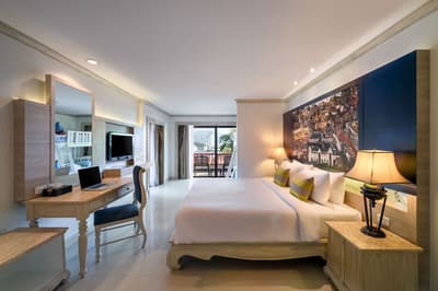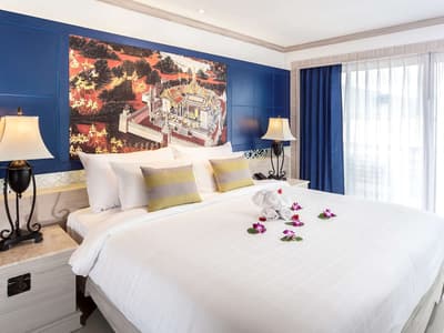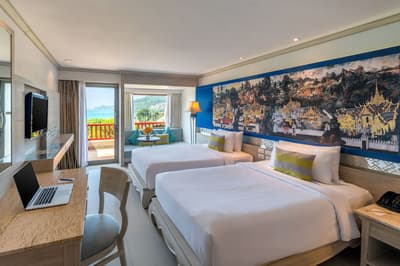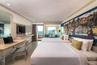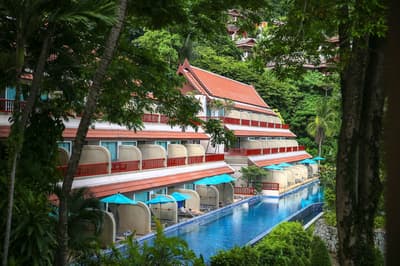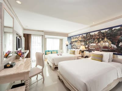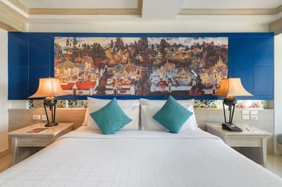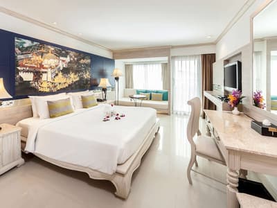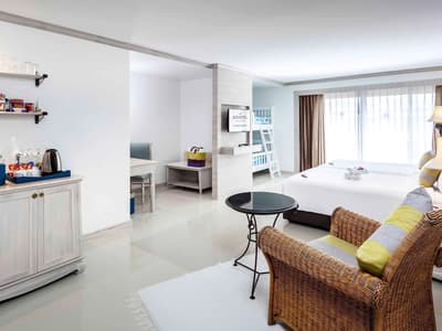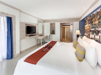 Top départ vers les étoiles depuis le Novotel Phuket Resort ! Votre séjour rime avec glamour, en total outfit tongs sur la plage de Patong. On déroule le tapis rouge des vacances : piscines sur trois niveaux, chambres avec vue et journées sous le signe de la farniente. Le shopping et la vie nocturne sont à portée de tuk tuk et si vous avez la bougeotte vous êtes tombés là où il fallait, tout en étant tranquillement perchés sur les hauteurs de la baie. L'architecture du complexe mixe à la perfection tradition et modernisme, tout en n'oubliant pas de jouer sur les clichés : palmiers et bassins avec cascades font évidemment partie du paysage. Les transats matchent à merveille avec les mosaïques bleu électrique de la piscine et, comme si tout fonctionnait par pair, les tuiles des toits pagodes rappellent la peinture ocre des balustrades des chambres. Celles-ci s'habillent de blanc, de petites tables aux plateaux marbrés et d'immenses fresques en tête de lit rendent hommage à la vie sur l'île au temps du Siam. Toutes les baies vitrées s'ouvrent sur des terrasses carrelées, certaines donnant de plein pied sur la piscine principale. À chaque âge, sa passion. Boxe Thaï pour les ados, soin du visage rajeunissant pour les mamans, en passant par des cours de tennis pour Papa et un kid's club qui enchante les plus petits (et les plus grands aussi). La liste des gadgets pour les geeks qui n'envisagent pas un seul moment de déconnecter : un web corner avec Mac et free wifi partout.