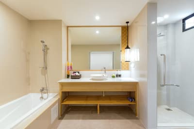 Installée à l’étage, cette belle chambre profite d’une belle vue sur la piscine du complexe. Elle peut accommoder 1 lit King ou 2 lits doubles. Petit coin salon avec de beaux fauteuils. Salle de bain chic avec douche à effet de pluie.