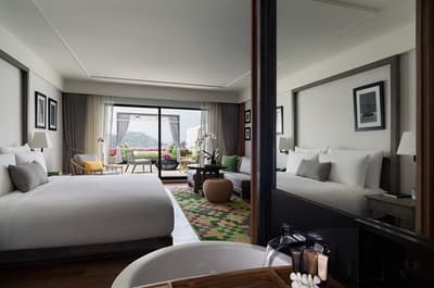 De son balcon, cette merveilleuse suite offre une vue époustouflante sur la baie et sur la plage de Nai Harn. Elle est spacieuse, confortable et baigne dans une atmosphère relaxante et reposante. Son extérieur est généreusement aménagé d’un lit de séjour et de beaux fauteuils pour apprécier la magnifique vue sur l’océan turquoise. Petit coin salon en chambre avec un canapé. Salle de bain chic avec baignoire.