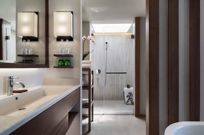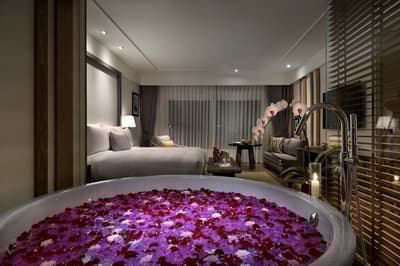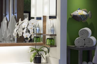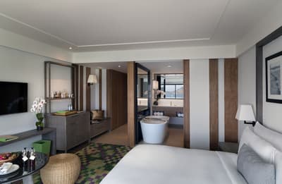 Entourée par la végétation luxuriante de cette partie du complexe, elle baigne dans une atmosphère calme et sereine. Elle dispose d’un coin salon en chambre avec de beaux fauteuils et une petite table. Ses grandes fenêtres vitrées profitent d’une vue merveilleuse sur la végétation et offrent une sensation d’espace et d’ouverture. Salle de bain chic avec baignoire.