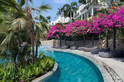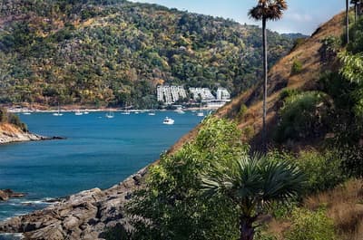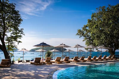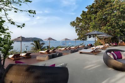 On ne peut pas faire mieux sur l'île : les rocheuses de Nai Harn Beach, un croissant de sable blanc couleur platine, des eaux turquoises. La plage fait tout simplement partie d'une des plus belles d'Asie. The Nai Harn a pris possession des lieux comme une évidence et l'hôtel se révèle encore plus beau en vrai que sur les photos ! On y chuchote même que Roger Moore ou encore Rudolph Nureyev y ont séjourné dans les années 80. Niché dans les collines, l'architecture pyramidale a été étudiée pour que vous profitiez d'une vue à 360 degrés... d'où que vous soyiez. Installez-vous confortablement dans des méridiennes chicissimes et délectez-vous d'une déco imaculée de blanc, entre suspensions en osier, Panton Chair et vases vernis habillés de fleurs de coton. Les terrasses surdimensionnées des chambres seront une excuse idéale pour passer vos journées à lire ou vos nuits à compter les étoiles. Côté chill, cocktails et snacks sont servis à toute heure, à même votre chaise longue. La piscine, bordée de galets, doublera votre temps passé dans l'eau avec ses jets massants envoûtants. À la tombée de la nuit, elle change de couleur comme par magie. L'heure parfaite pour grimper sur le rooftop et siroter une Chang Beer face au panorama. Votre programme du lendemain est chargé : détox au spa entre deux noix de coco fraîches, déjeuner bio au Cosmo et snorkeling interminable dans la baie de Nai Harn.