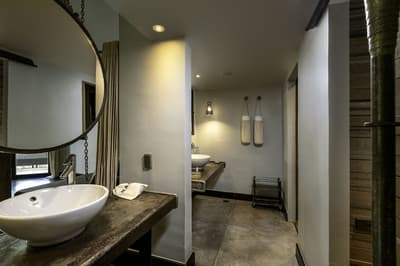 Nichée parmi la nature luxuriante du complexe, elle baigne dans le calme et l’intimité. Son escape extérieure est généreusement aménagée d’une piscine, d’une baignoire contemporaine, d’un fauteuil et de belles chaises. Elle est propice à la détente. Petit coin salon avec des fauteuils. Salle de bain rustique avec douche à effet de pluie.