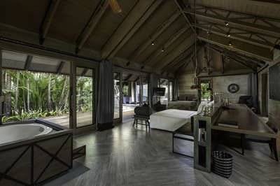 Incroyablement spacieuse, elle dispose de 2 chambres et offre un séjour confortable et luxueux. Elle est entourée de verdures luxuriantes et baigne dans une atmosphère calme et reposante. Son extérieur est aménagé d’un jacuzzi, de longs canapés et d’une petite table à manger. Elle dispose d’un salon meublé de beaux fauteuils. Salle de bain rustique avec douche à effet de pluie, sauna et de tables de massage.
