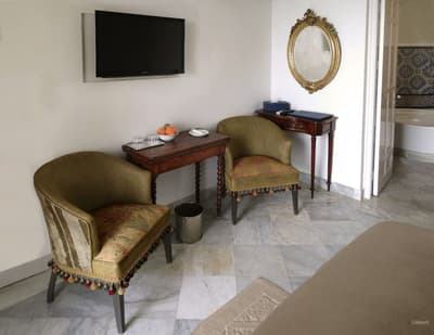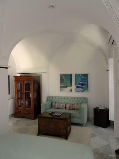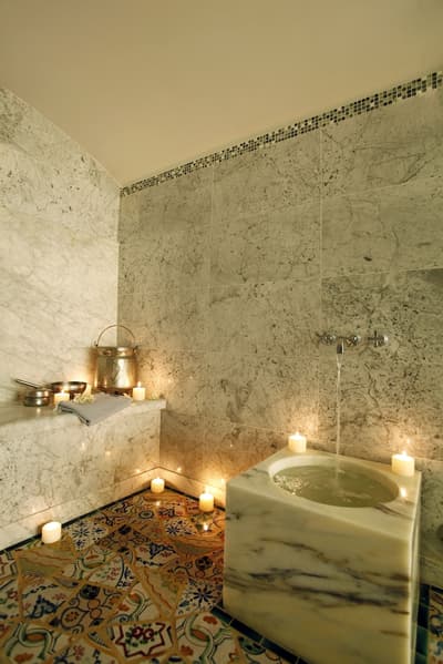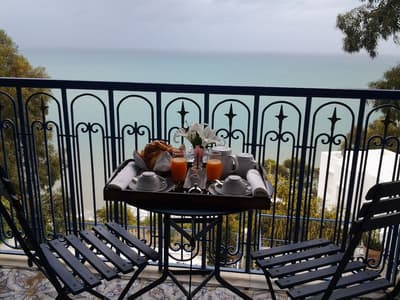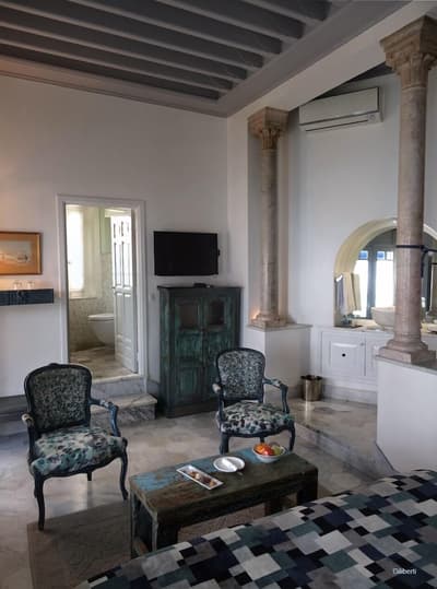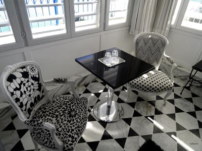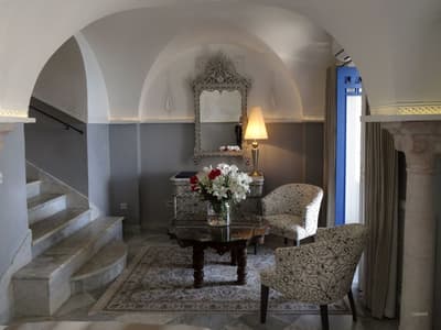 La vue, la vue, la vue. L’emplacement, l’emplacement, l’emplacement. Des arguments dignes d’un super agent immobilier ? Certes. Mais c’est bien le cadre exceptionnel de l’endroit qui va vous séduire ! Imaginez une falaise abrupte qui domine une baie méditerranéenne et l’archipel des iles de Zembra et Zembretta. Un panorama à 270° sur la capitale tunisienne, à quelques kilomètres plus au sud et dont on aperçoit les lumières le soir. Effet waouh garanti ! Et c'est aussi efficace qu’une pilule antistress... Se poser, admirer le paysage en sirotant un thé à la menthe ou une citronnade fraichement pressée. Prendre le temps d’admirer aussi l’architecture de la Villa Bleue et sa décoration époustouflante : le bleu, le blanc et le gris s’y conjuguent en harmonie. Les 13 chambres et suites sont toutes décorées différemment, mais ont les matériaux nobles comme point commun : marbre et céramique. Et leurs formes varient agréablement, les pièces étant bâties sur des dénivelés. Ici une pièce toute en rondeur, ici une chambre carrée, là une pièce en bas d’un escalier, enfin, une autre au sommet d’une tourelle... Un vrai dédale, à l’image du village de Sidi Bou Saïd, si caractéristique avec ses maisons blanches et ses portes d’un bleu pimpant. Un lieu idéal pour les romantiques et les amoureux !