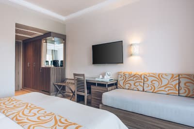 Encore plus spacieuse, c’est du pur confort ! Le balcon est meublé et profite d’une vue sur la piscine. Elle a tout le nécessaire pour un séjour des plus agréables. Elle accommode un grand lit king et dispose d’un coin salon. Salle de bain avec douche à effet de pluie.