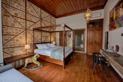 L’ensemble est joliment décoré avec des touches de bois, des tableaux ornant le mur, des murs en pierre, un mobilier classique et se complète dans des tons clairs. La chambre est équipée d’un lit à baldaquin king-size avec une literie de qualité. La salle de bains spacieuse en marbre comporte toutes les commodités nécessaires. Le tout dans une atmosphère conviviale !