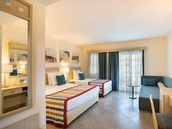 Elle bénéficie d’une décoration contemporaine avec un beau carrelage, des tableaux colorés accrochés aux murs, un mobilier classique et se complète dans des couleurs apaisantes. La chambre est dotée d’un lit double, d'un lit simple et d'un canapé pour un maximum de confort. La spacieuse salle de bains en marbre est équipée d’une douche et de toutes les commodités nécessaires. Ambiance relaxante !
