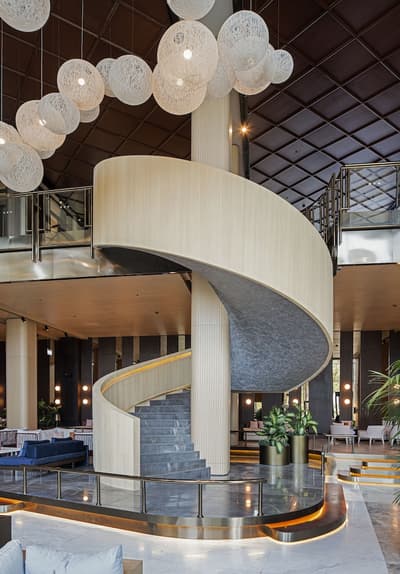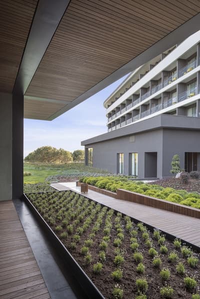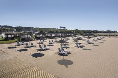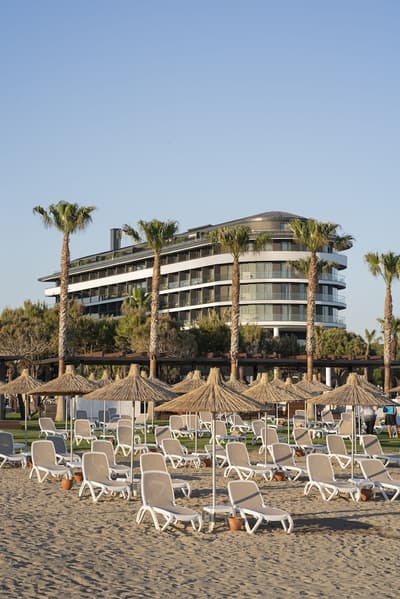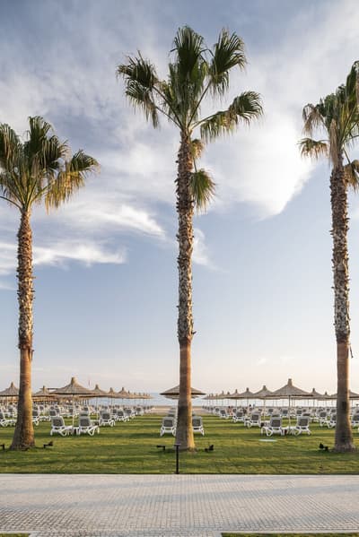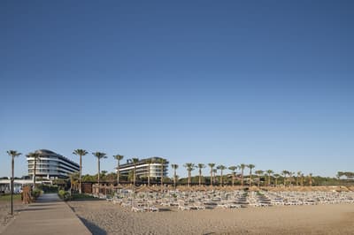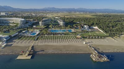 Un arbre planté en plein milieu du lobby, étonnant, non ? Et bien pas tant que ça en fait. Lors de sa construction, le Voyage Belek Golf & Spa ne voulait pas déraciner un seul arbre. Pari réussi ! Si les formes arrondies des deux grands buildings de l’hôtel auraient de quoi rendre jalouse une bouteille d’Orangina, le Voyage Belek Golf & Spa ne brille pas par la délicatesse de son architecture. Mais, avec un peu d’imagination, vous pouvez vous croire à bord d’un immense bateau de croisière…ou pas. Les bâtiments sont énormes, ok, mais le design contemporain à l’intérieur vous fait vite passer à autre chose. Le décorateur s’est éclaté avec les formes géométriques un peu partout ! A l’extérieur, la palmeraie est tellement grande que vous pourrez y faire votre footing. Côté piscine, c’est le même délire : le bassin est immense, vous la traversez grâce à un pont en bois. Les animations se déroulent ici mais si vous avez envie de calme, une autre piscine est dispo. Il y en a même une spécialement réservée aux clients des villas. Après vous avoir fait peur à l’Aquapark, rien de tel qu’un petit bain de mer ! Et vous avez de quoi faire avec les 300 mètres de plage. Une partie est d’ailleurs réservée aux plus de 16 ans. Pour finir en beauté, direction le spa et ses lits de repos aussi grands que ceux des chambres. Le bain turc est magnifique. C’est l’endroit idéal pour retrouver votre peau de bébé !