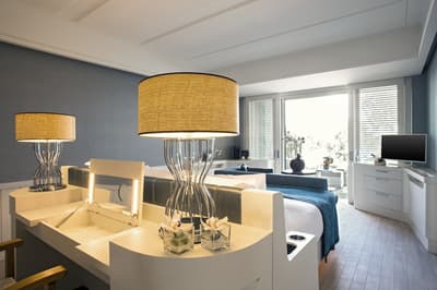 Luxueuse, elle est idéale pour deux personnes et offre une vue captivante sur la mer azur que vous pourrez contempler du balcon aménagé, en toute sérénité. Elle comporte des équipements modernes tels qu’une connexion wi-fi et un bureau, si vous devez travailler. À noter que des chambres communicantes sont disponibles (pour certaines chambres).