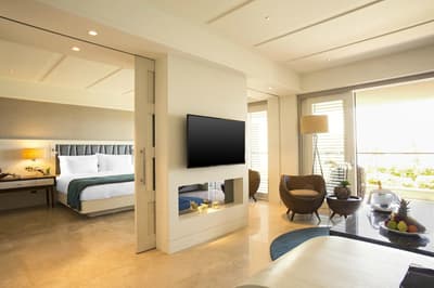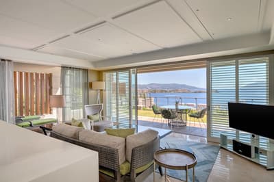 Cette magnifique chambre comprend un bain à remous sur le patio ou la véranda pour quatre personnes, afin de passer des moments de luxuriante sérénité. Après une longue journée d’activités, détendez-vous dans le mobilier en osier, tout en contemplant la vue panoramique sur la mer. À noter que des chambres communicantes peuvent être disponibles.