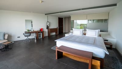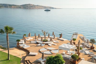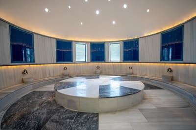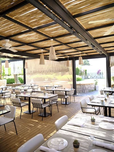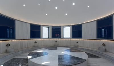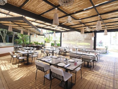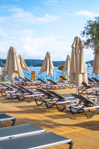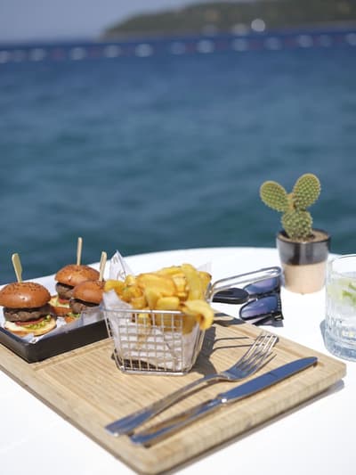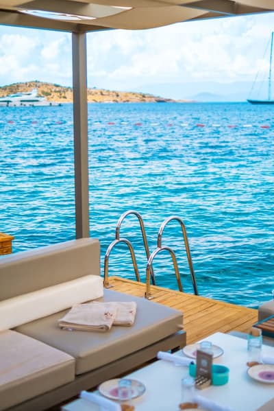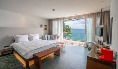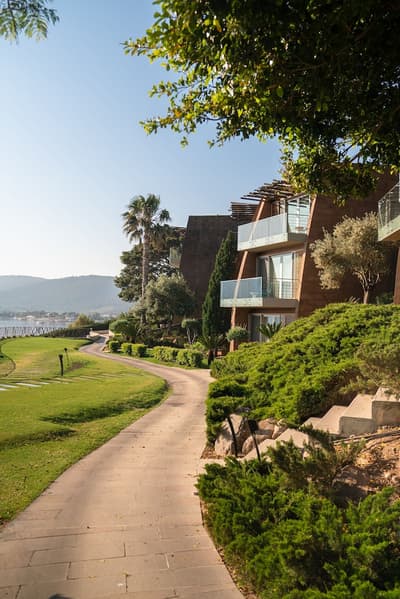 C’est pas la nature qui s’est adaptée au Kuum Hotel & Spa mais bien le Kuum Hotel & Spa qui s’est adapté à la nature ! L’établissement s’évapore totalement dans le décor. A tel point que la beauté du jardin détonne avec la végétation roussie par le soleil des collines environnantes. La déco met l’accent sur la simplicité en donnant dans le minimalisme. L’hôtel se compose d’une multitude de petits bâtiments de deux étages, qui ont un je ne sais quoi de troglodyte. Le complexe s’étale sur toute la longueur de la côte. Vous reliez les différentes infrastructures à pied, grâce à des petits chemins en pierre, à deux pas de la mer. D’ailleurs, la piscine rectangulaire principale est juste en face, tout comme les châteaux et les toboggans gonflables pour les kids. Le Kumm Hotel & Spa ne possède pas de plage, mais pas grave : il a construit une immense plateforme de 500 mètres en arc-de-cercle avec accès direct à la Méditerranée. Vous aurez presque l’impression d’être sur le deck d’un bateau. Terminez votre promenade dans les 2 200 m² du spa ! Vous devez évidemment faire un tour au bain turc, un grand classique du pays. Quant à la salle de relaxation, où se trouve la piscine intérieure, les jeux de lumière y sont tellement fous qu’on se croirait dans une vraie discothèque. Sans la musique à fond, of course...