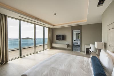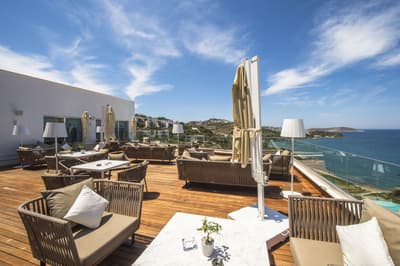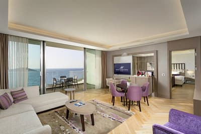 Cette magnifique suite s’ouvre sur deux grands balcons privés aménagés et offre une vue exceptionnelle sur la mer Égée. Après une longue journée d’activités shopping et excursion, vous pourrez vous relaxer dans les transats pour profiter du soleil. Située dans le bâtiment principal, elle bénéficie d’une luminosité naturelle, grâce aux grandes baies vitrées.