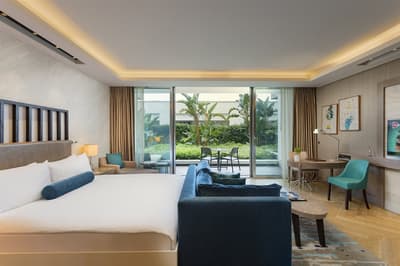 Elle bénéficie d’une décoration luxueuse et soignée avec un beau parquet, un mobilier et des fauteuils tendances et se complète dans des tons clairs. La chambre est dotée d’un lit king avec une literie de qualité et l’élégante salle de bains est entièrement équipée avec un double vasque. Le tout dans une ambiance tropicale !