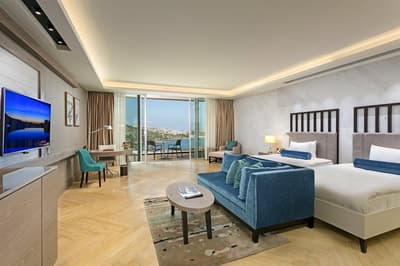 Située dans un cadre enchanteur, elle offre une vue imprenable sur la mer et dispose d’un grand balcon privé aménagé, d’où vous pourrez admirer le coucher de soleil unique. Elle dispose d’équipements modernes et se trouve dans le bâtiment principal, offrant aux clients des installations facilement accessibles.