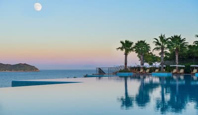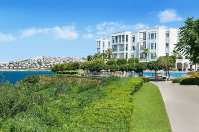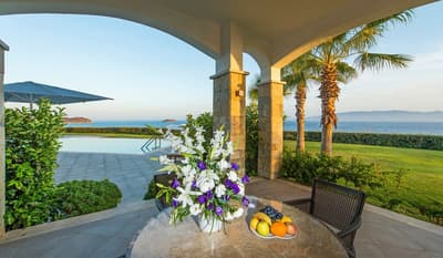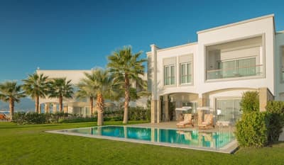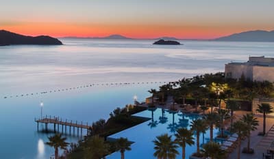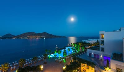 Le Xanadu Island Bodrum a tous les avantages d’une île, sans les contraintes ! Le site est incroyable. C’est une péninsule privée qui semble vouloir s’échapper dans le bleu profond de la mer Egée. Un bout de terre vert perché sur des falaises calcaires, et relié au continent par une petite route. Mais aurez-vous envie de reprendre le chemin après avoir posé vos valises dans ce petit paradis ? Vous avez tout sous la main ici, des grandes piscines à débordement jusqu’à la plage de sable et de galets. Comble de la tentation, les transats crème super élégants avec leur ombrelle totalement couvrante. Ils vous font de l’œil un peu partout. Regardez comme ils sont joliment alignés sur le sable ! En plus, vous allez adorer vous baigner dans cette eau claire. La plage est même labellisée Pavillon Bleu, gage de pureté ! Le souffle chaud du vent que l’on sent parfois vous donne une sensation unique d’être au cœur des éléments. Peu importe où se trouve votre chambre, vous aurez toujours la mer pour horizon. Les belles villas blanches sont carrément exceptionnelles ! Elles ont leur propre piscine privée et des vues magiques sur les îles grecques au large. On y a presque l’impression d’être seul au monde, face à l’immensité de la grande bleue !