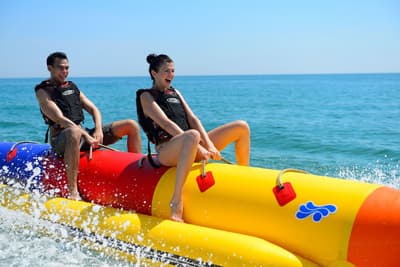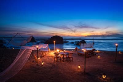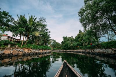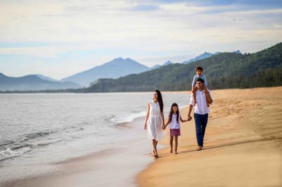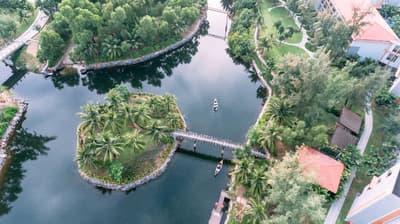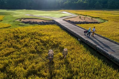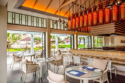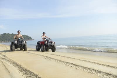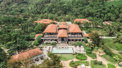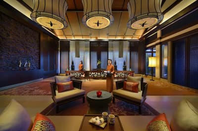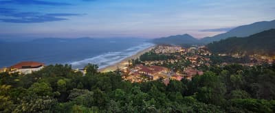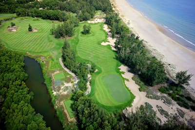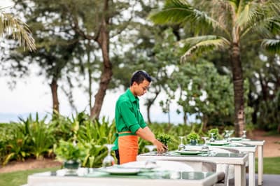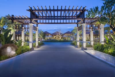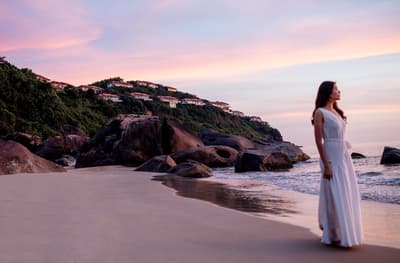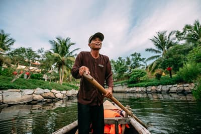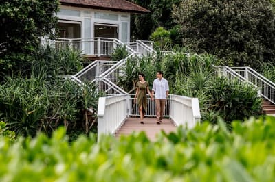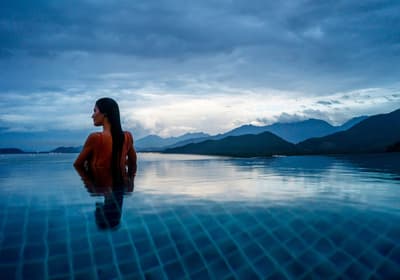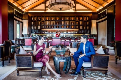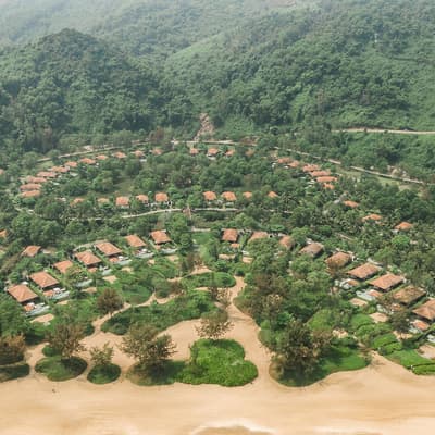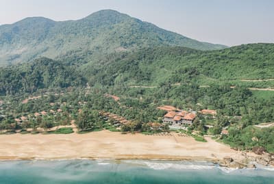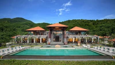 Seriez-vous partant pour trois ou quatre jours de Paradise on Earth ? Histoire de souffler après votre grand tour d'Asie ou, plus modestement, votre traversée du Vietnam ? Ces pool villas hyper-luxe vous attendent, avec chacune jacuzzi et piscine pour vous tout seul, afin de se délasser, juste avant d'organiser à domicile votre propre barbecue en parfaite autarcie. Disposés à flanc de colline ou de cap avançant dans le mer de Chine, ou en éventail face à la plage blonde, les constructions et les villas abritent une déco racée, aux tons brun chic et un rien sévère, sans mièvrerie ni exotisme ridicule, avec des plafonds en pyramide, des lits accueillants et des peintures murales aux fleurs épanouies dans leurs couleurs vives. Et pour ce qui est des parties communes ? Ce resort, qui reste un des représentants les plus réussis de la chaîne écolo Banyan Tree, évoque un palais d'Asie du Sud-Est, géométrique et équilibré, avec en plus la transparence légère des vitrages contemporains et de beaux objets de l'ancienne Cochinchine. La piscine en guise de bassin d'agrément fait pendant au bassin intérieur, gardé par de grosses cloches anciennes.