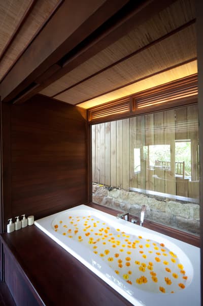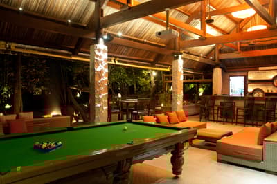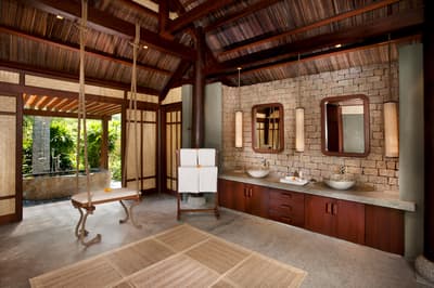 L'étage inférieur comprend une grande salle de bains avec douche, baignoire séparée, toilettes, deux lavabos et armoires. Le niveau intermédiaire est un salon en plein air avec bar, canapés, salle à manger et piscine. Le tout dans une atmosphère exotique !