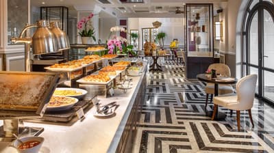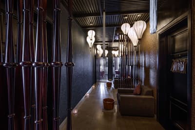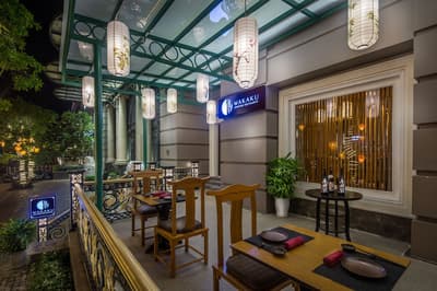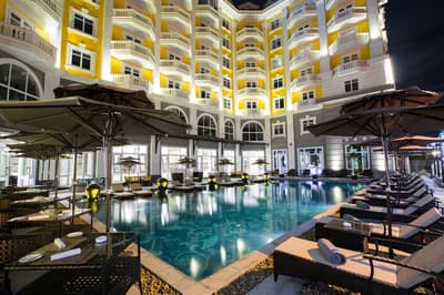 Sur cette façade jaune typique du baroque austro-hongrois, les chambres alignent leurs balcons. Que ce soit côté ville ou côté cours, rares sont les Français qui seront éblouis par les extérieurs, qui mêlent le vieux classique haussmannien à sa version asiatique un rien mégalomane, exception faite de l'opulente piscine en belle mosaïque qu'on croirait importée d'une villa romaine. L'intérieur, est plutôt bien agencé. La restauration s'étire entre les sushis et la pâtisserie française. Dans les parties communes, l'hôtel tire le meilleur parti des matériaux, même si la dominante est parfois un peu sombre. Les fantasmes parisiens de verrières et de moulures et le gigantisme qu'on reproche parfois au luxe indochinois sont tempérés par la sobriété du design japonais. Une partie des chambres, équipées d'un balcon, se penchent sur la rivière Thu Bon, cours d'eau chéri de la vieille ville de Hoi An. Lits et fenêtres sont parés de voiles légers ou de tissus épais. Les claustrae, notamment dans les suites, séparent à demi les espaces à vivre où, en plein milieu, de généreuses baignoires prennent souvent un peu trop leurs aises. Comment qualifier ce style ? Peut-on dire kitsch-et-chic ?