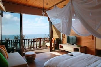 Vous accéderez à l’étage supérieur, par un escalier extérieur en bois, pour découvrir une chambre avec vue panoramique sur l'océan de Con Dao. Le rez-de-chaussée comprend une grande salle de bains à aire ouverte avec une baignoire donnant sur la mer, une double vasque et une douche privée dans le jardin. Le tout dans une ambiance exotique !