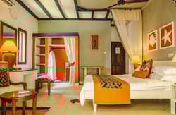 Dans un style de décoration mêlant le contemporain et le traditionnel africain, elle arbore un beau carrelage, un mobilier en bois, des tissus aux motifs africains, de l’artisanat local et se complète dans des couleurs chaleureuses. La chambre est dotée d’un lit double, de lits bébés gratuits avec une literie de qualité et la salle de bains privée est équipée d’une douche baignoire et douche séparées et de toutes les commodités nécessaires. Le tout dans une ambiance relaxante !