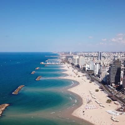 Le front de mer de Tel Aviv s'étend le long de la promenade Herbert Samuel. Ce lieu de rencontre prisé des locaux et des touristes offre une vue imprenable sur la Méditerranée. Les terrasses des cafés et restaurants permettent de profiter du coucher de soleil sur la mer.